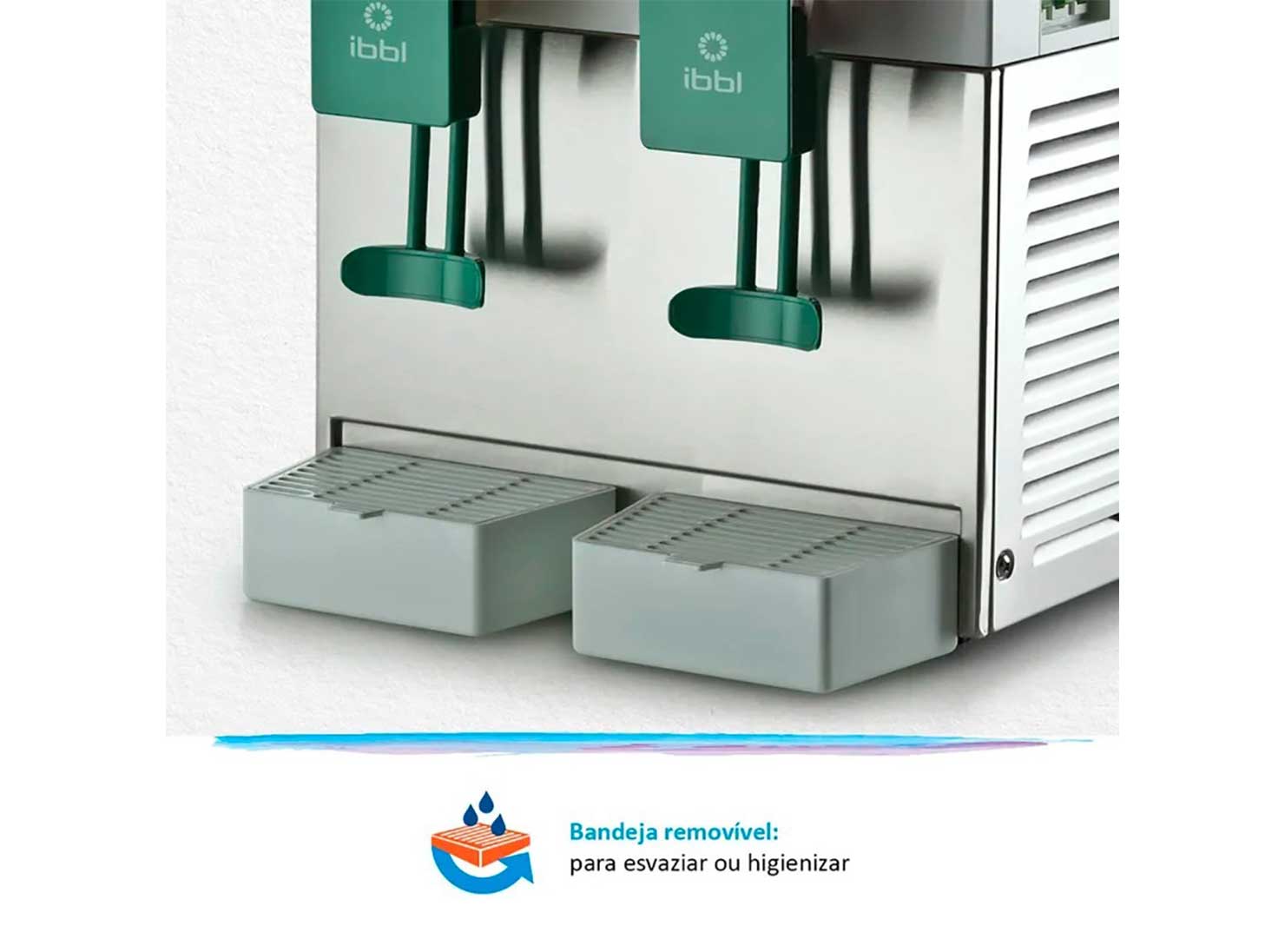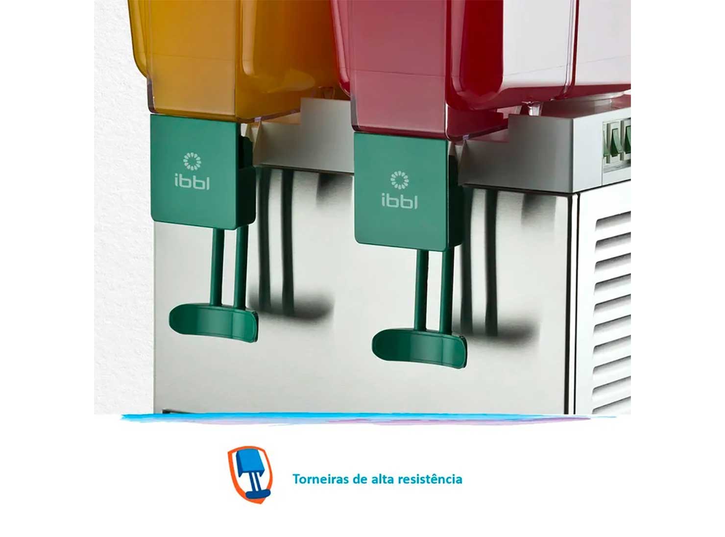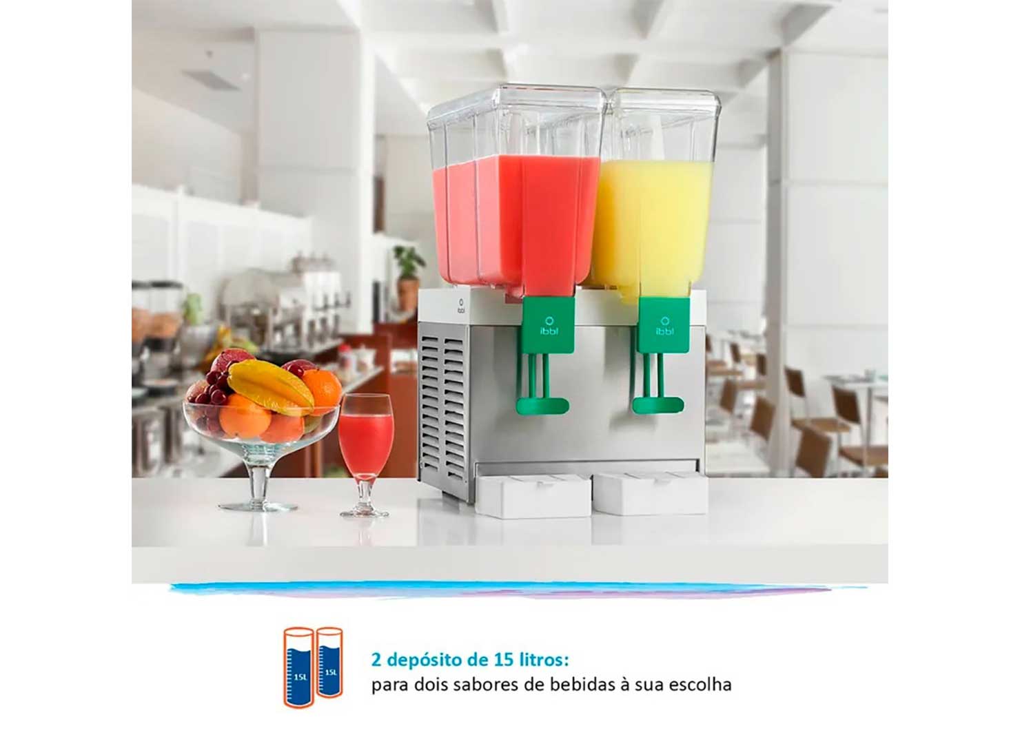 Ofrezca una opción doble con la Refresqueira BBS 2.Con 2 tanques de 15 litros cada uno, almacene dos opciones de bebidas en la temperatura ideal para elconsumo. Este modelo IBBL posee grifos totalmente desmontables para higienización, asegura buenaconservación de los líquidos con el control automático de temperatura y bajo consumo de energía con elsistema de refrigeración equilibrada.