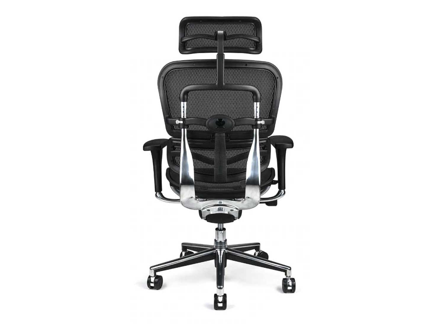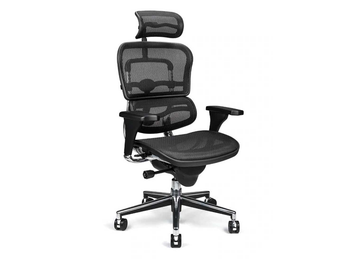 Silla giratoria Ergohuman de respaldo alto con reposacabezas, malla negra y base cromada.